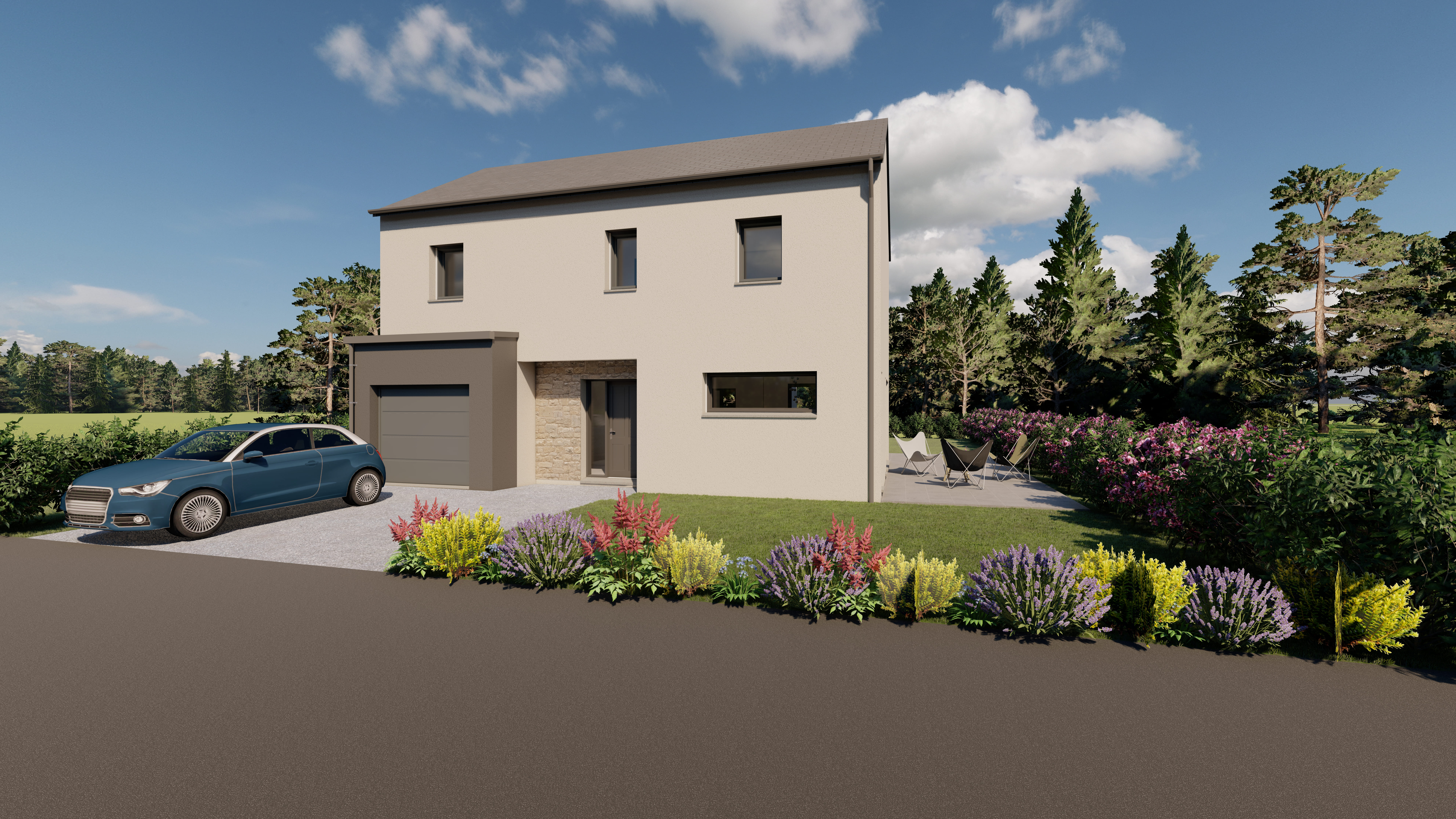 Prix incluant terrain + construction hors assurance DO, frais annexes et frais de notaire.