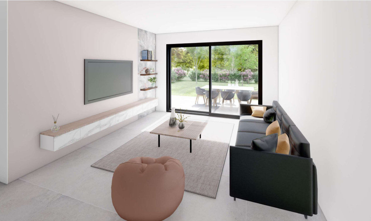 Au RDC elle se compose d'une entrée protégée, d'un salon-séjour-cuisine traversant d'environ 38m² lumineux, d'un WC indépendant, un garage et d'une chambre avec sa SDE privative.