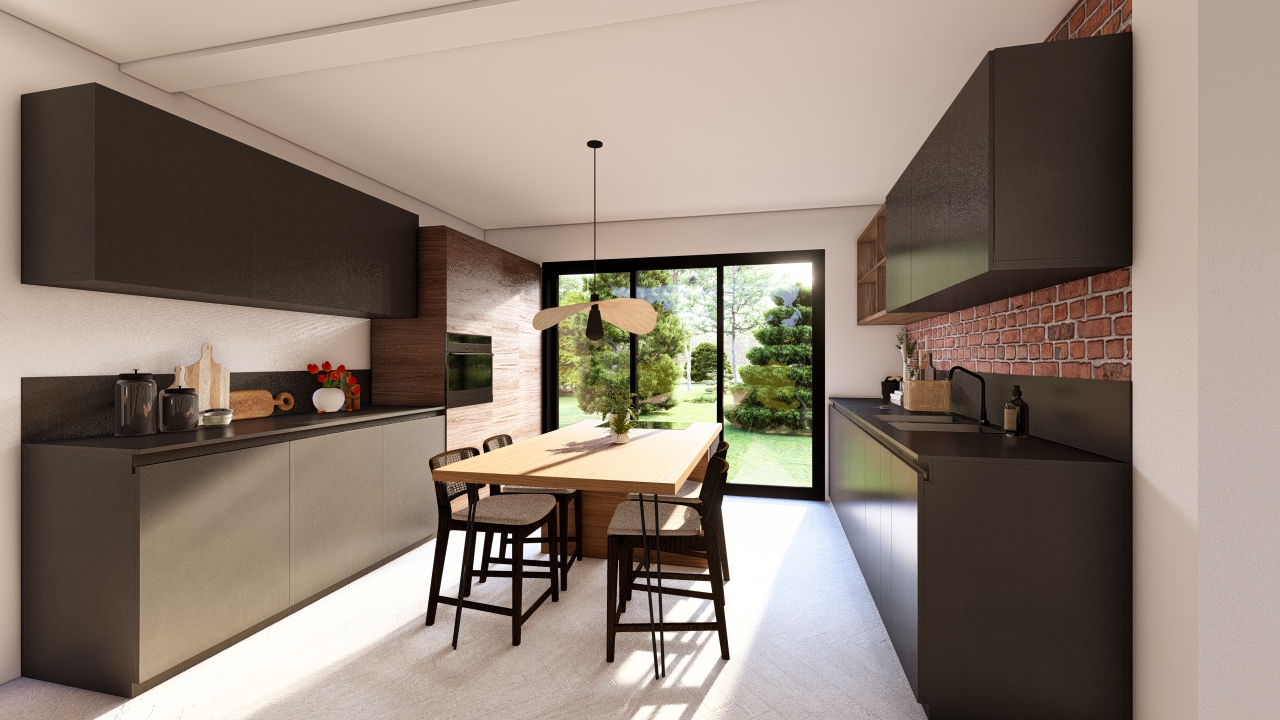 au RDC, une grande pièce lumineuse de plus de 40m², avec cuisine ouverte, pour des moments de partage et de convivialité en famille et entre amis, un cellier isolé, WC et un garage de 17m².