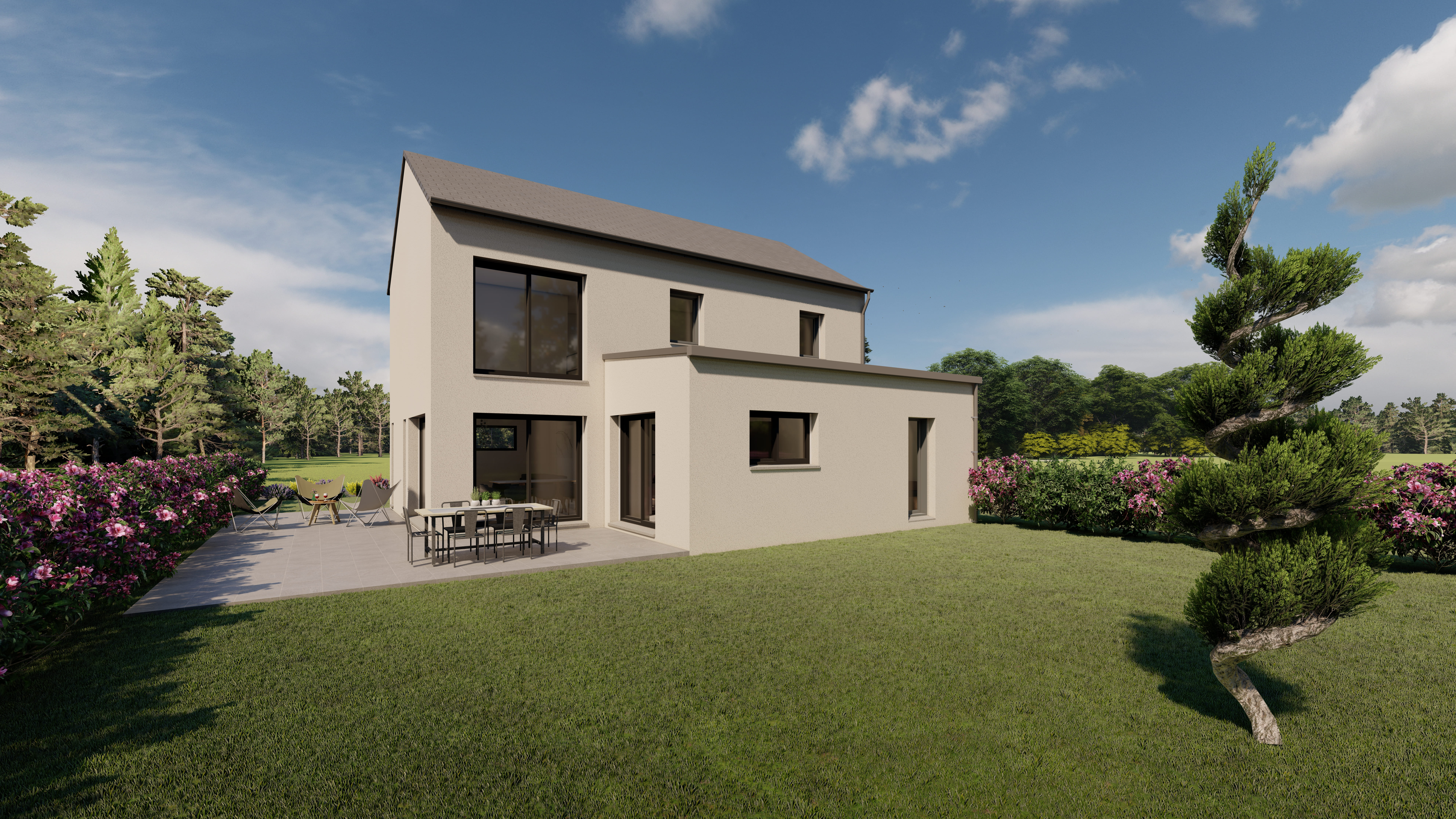 Prix incluant terrain + construction hors assurance DO, frais annexes et frais de notaire.