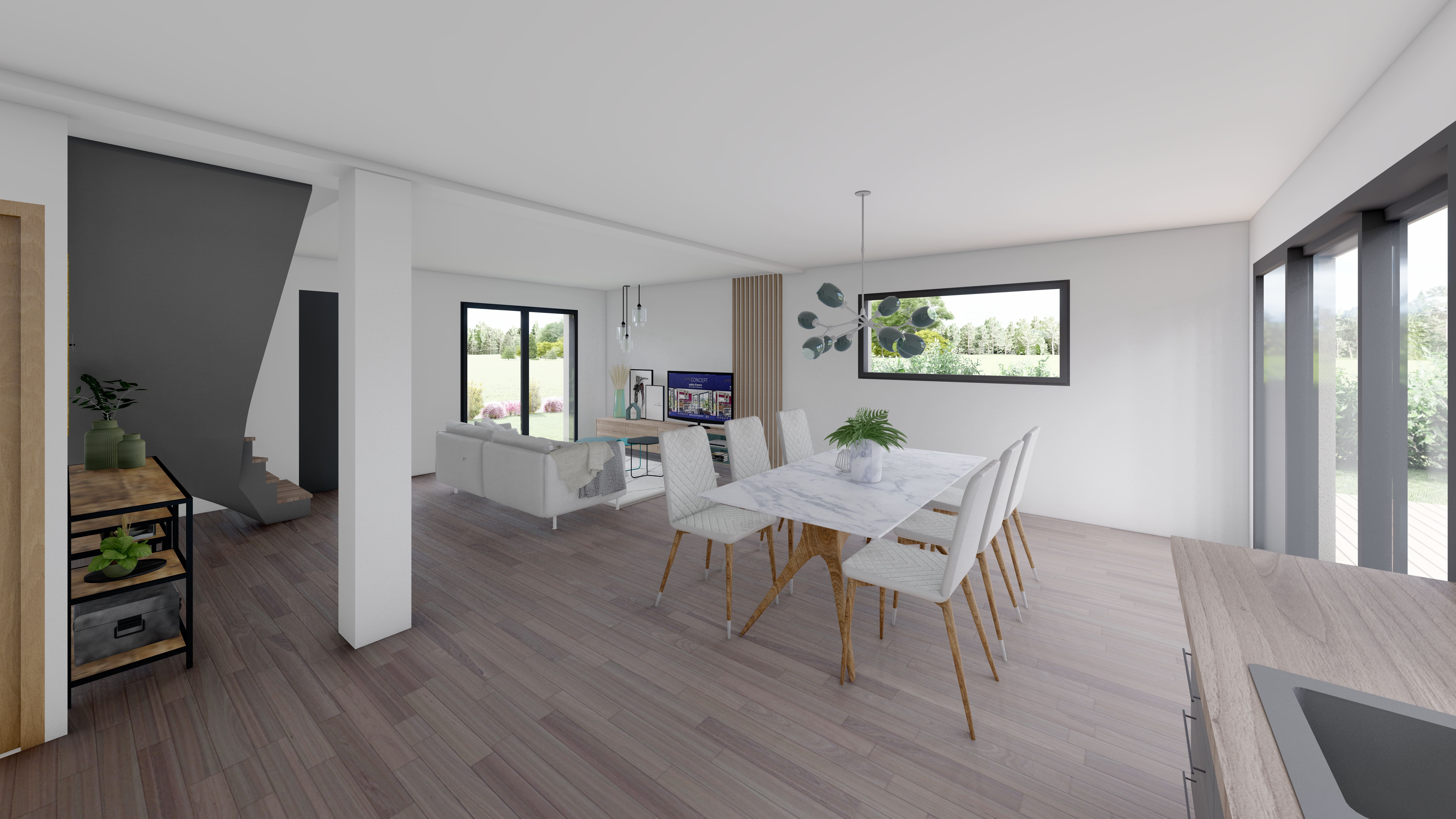Au rez-de-chaussée, cette maison bénéficie d'une entrée protégée, d'une pièce de vie de 44m² lumineuse avec une triple exposition, d'un cellier isolé donnant sur le garage et la cuisine, d'une chambre avec placard et d'un WC indépendant.